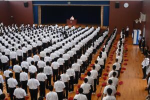 続いて終業式が行われました。式辞の中で校長先生が旧生徒会役員の活動に触れられました。生徒自ら校則の改訂を求めて活動した生徒会は、呉港高校においてはおそらく初めてであり、その自主自律の精神と行動力を高く評価するお話がありました。また、これから始まる夏休み、自由になる時間を有効に使い、意義深い長期休暇となるよう行動してほしいというお話がありました。