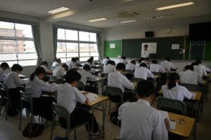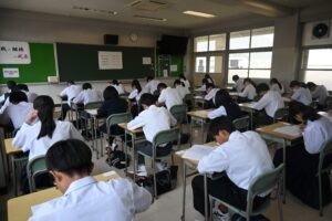 高校の教室での受験という、本番さながらの形式で模擬試験を受けました。多くの受験生が緊張した様子でした。