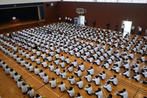 式辞の中で校長先生から、「3年生は夏休みに頑張った成果をそれぞれの進路選択において発揮してください。1、2年生は2学期以降、学校生活の中で中心的存在として学校行事等に取り組んでください。」というお話がありました。