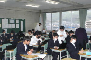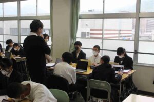 会社の業務内容を聴いたり、働くということに対する心構えなどを話していただきました。生徒たちはメモを取りながら熱心に聴いていました。