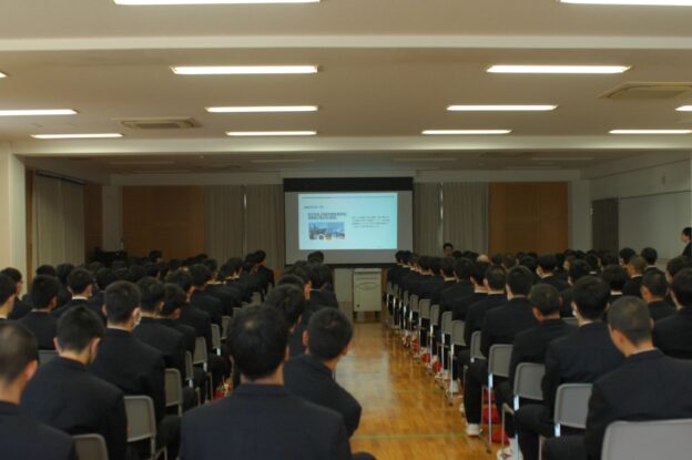 4月10日(月)、機械科・電気情報科の進路セミナーは講演会で幕を開けました。呉精器工業株式会社の中里嘉孝社長をお迎えし、講演会を開催しました。