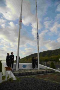 旗係が掲揚台に旗を揚げ、