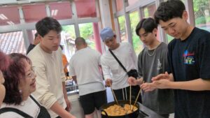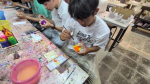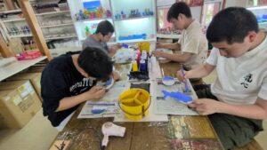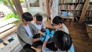 第2団の修学旅行3日目の午前中は、むら咲むらにて沖縄文化の体験を行いました。シーサーやジンベエザメの色付け、サーターアンダギーやちんすこう作りなど、一人ひとりが選んだ体験に没頭。試行錯誤しながら、自分だけの素敵な作品を完成させることができました。